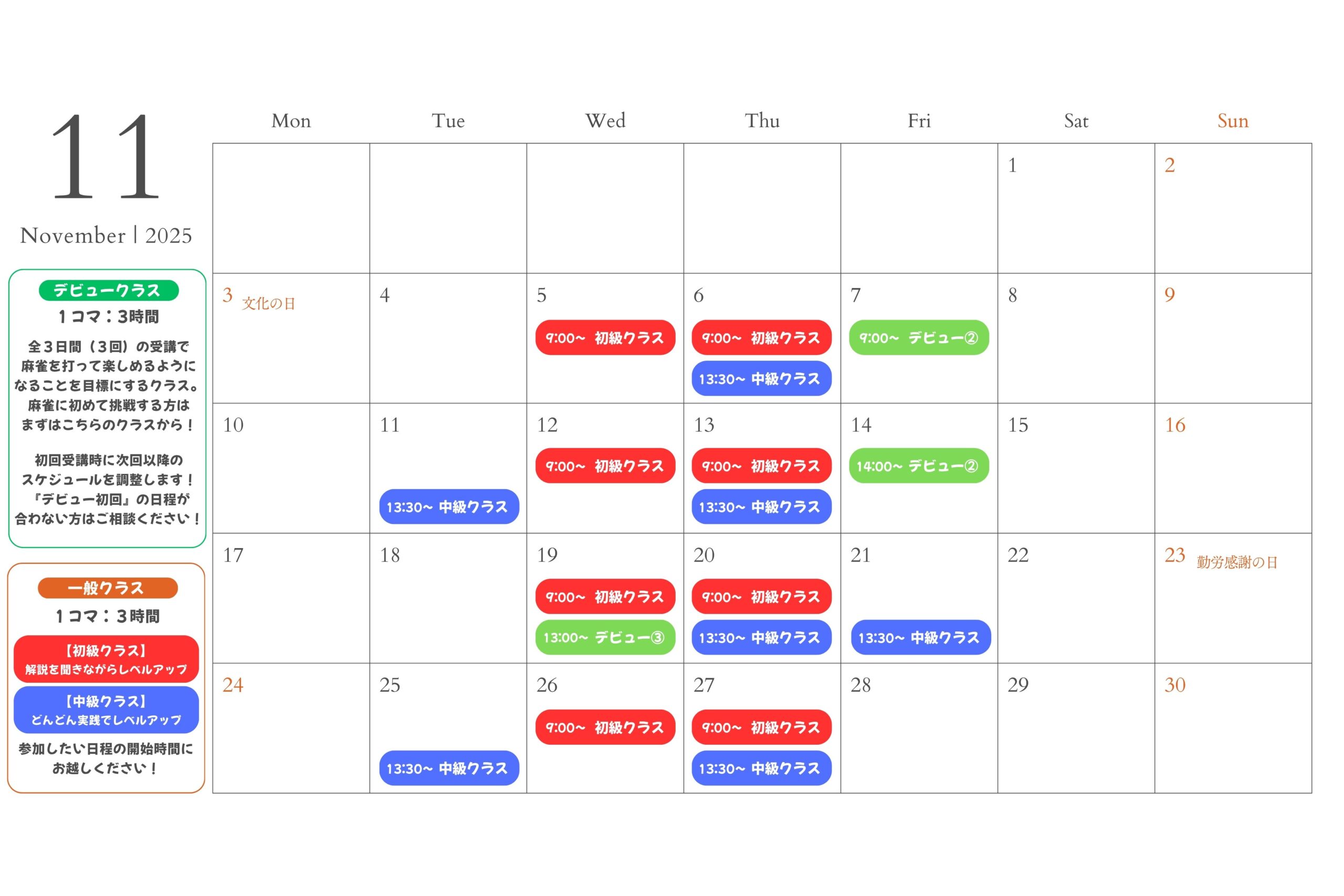 これから麻雀を始めたい方のための入門クラスです。ルールや牌の扱い方など、基礎の基礎から丁寧に学び、全3コマ(合計9時間)のカリキュラムで「ひとりで麻雀が打てる」ことを目標に進めます。初めてでも安心して参加でき、麻雀の楽しさに触れながら、自分のペースでステップアップできる内容です。